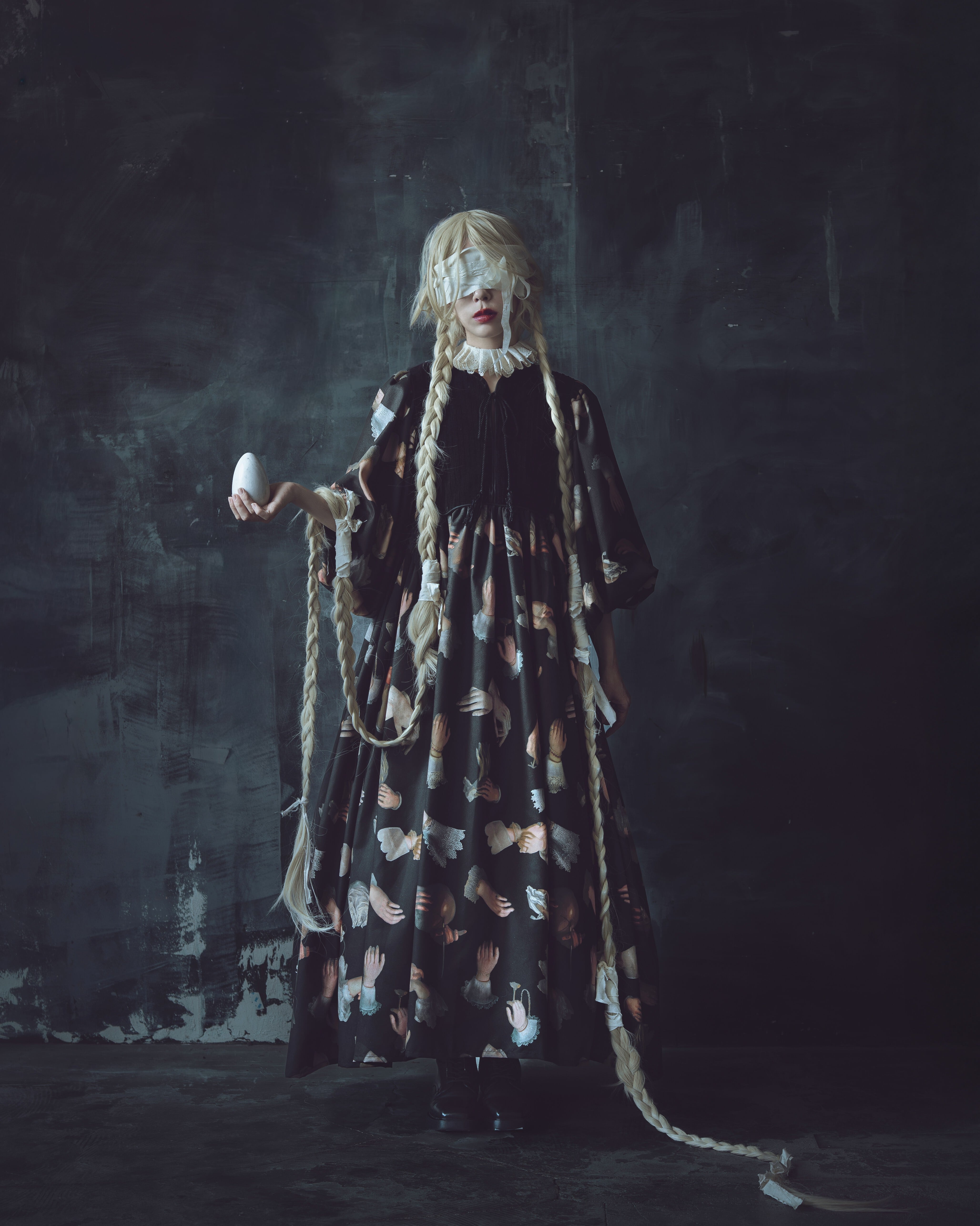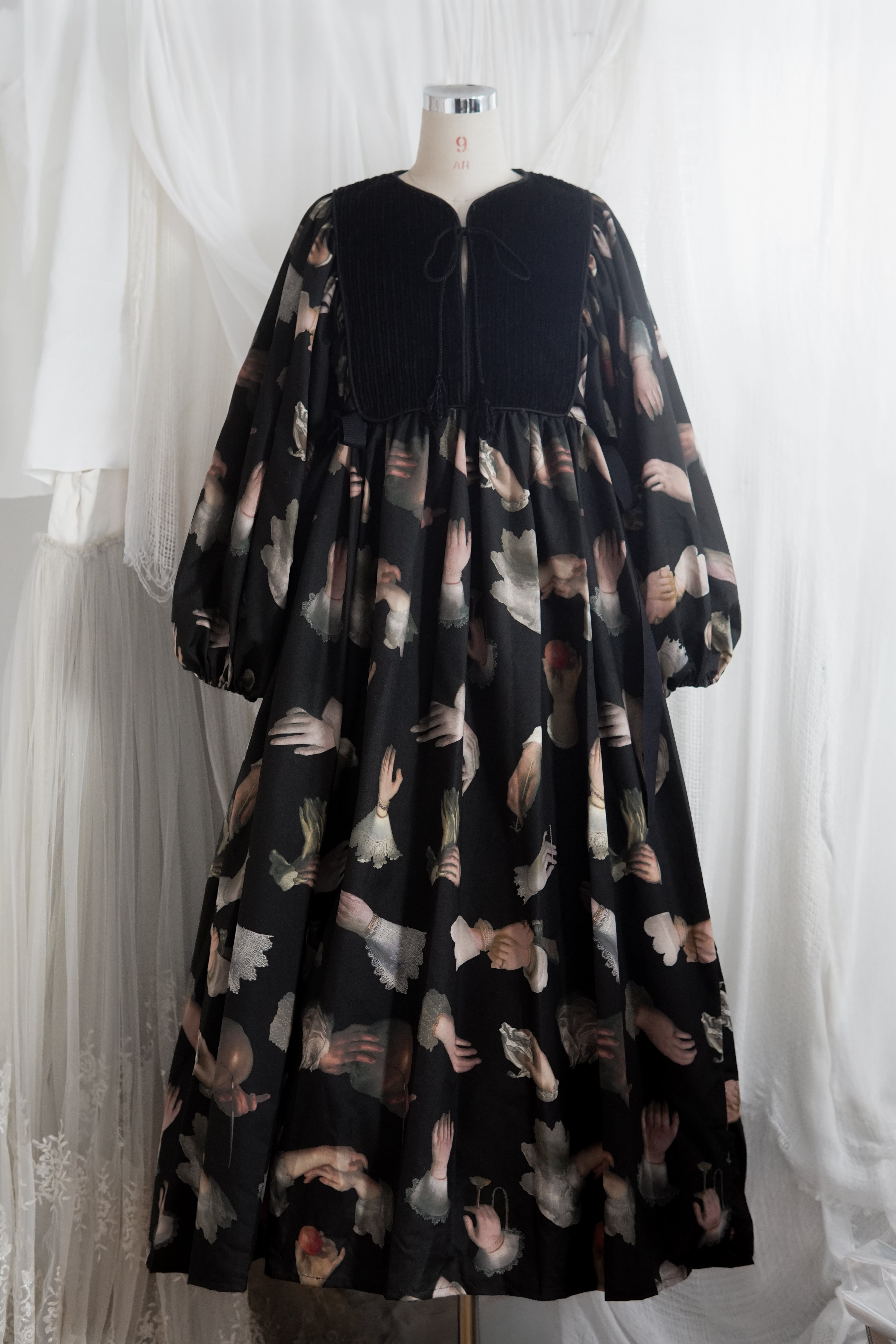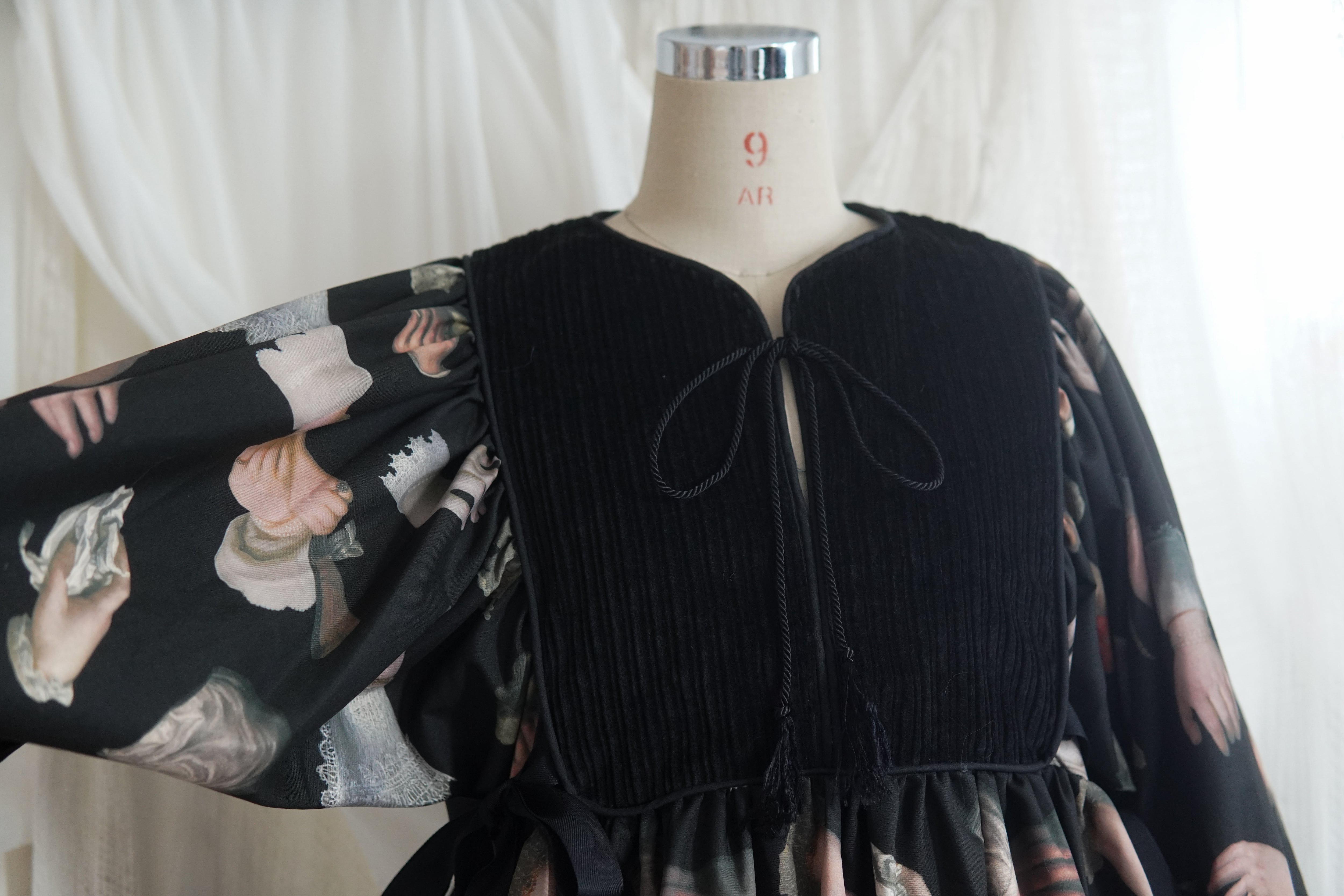太コーデュロイ・パイピング・たっぷりとした袖が特徴的な重厚感のあるワンピース。