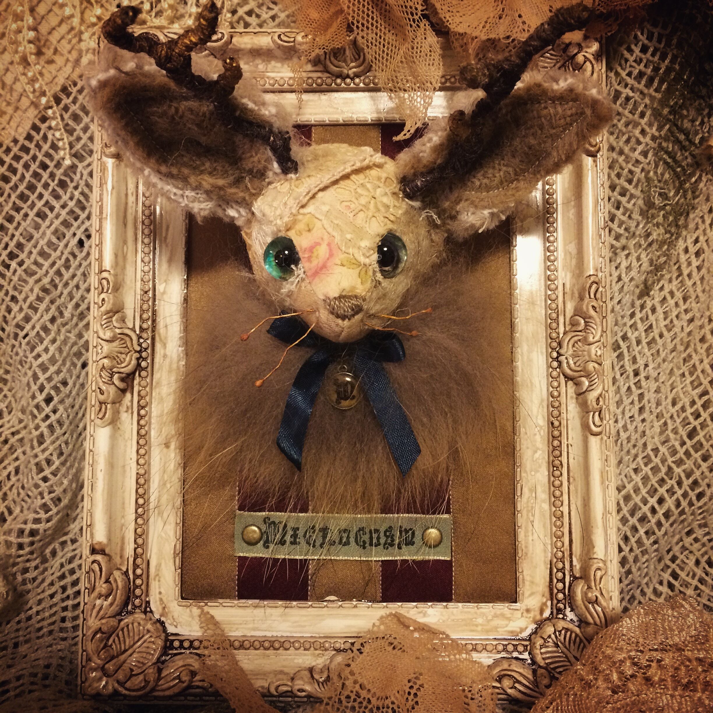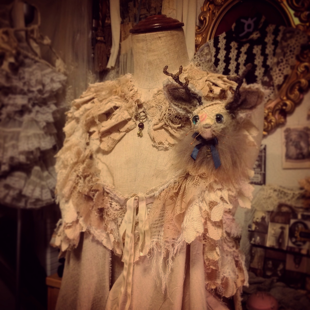 デッドストックの生地、アンティークレース、羊毛などの素材を染色し、ひとつひとつ手作業で縫いあわせた作品となります。