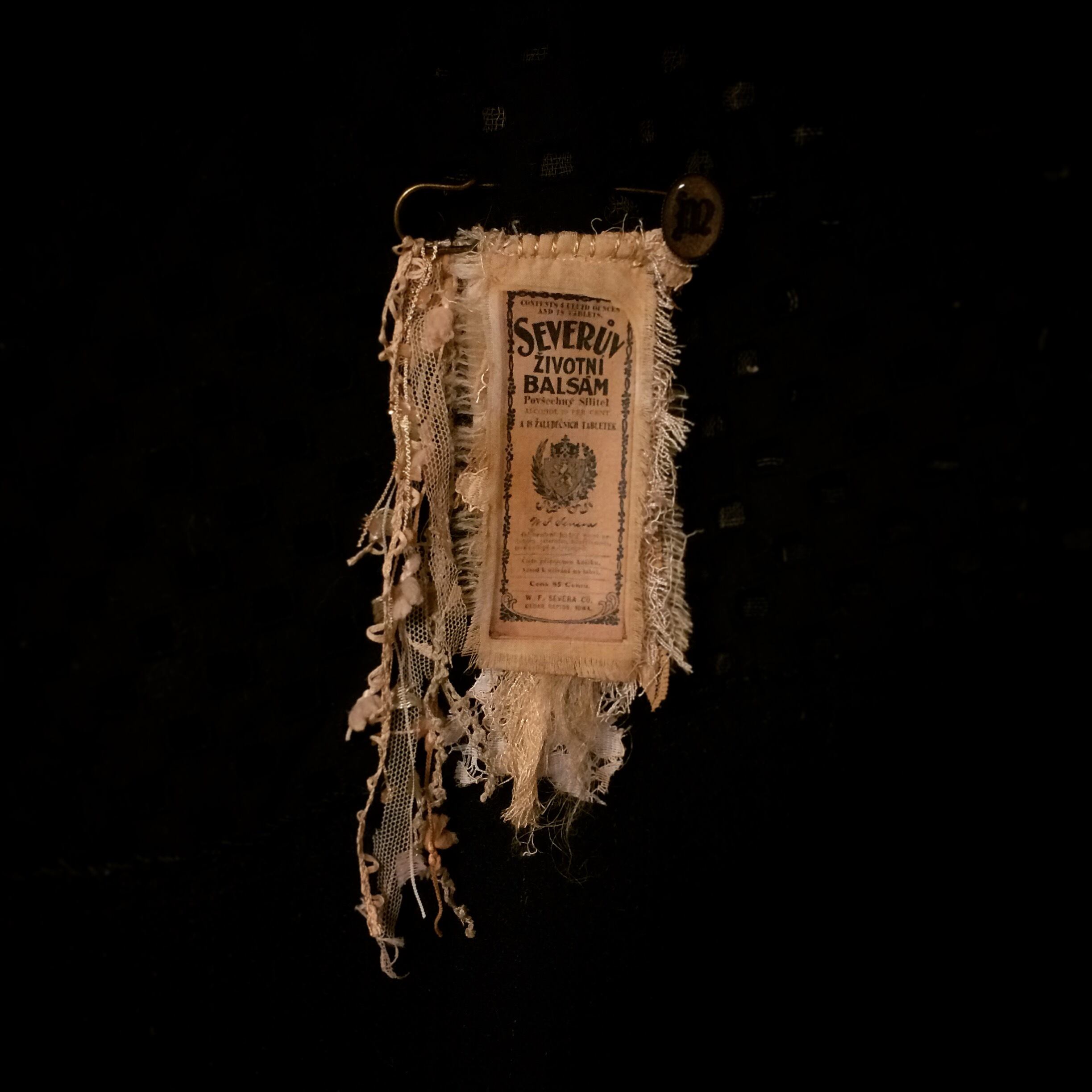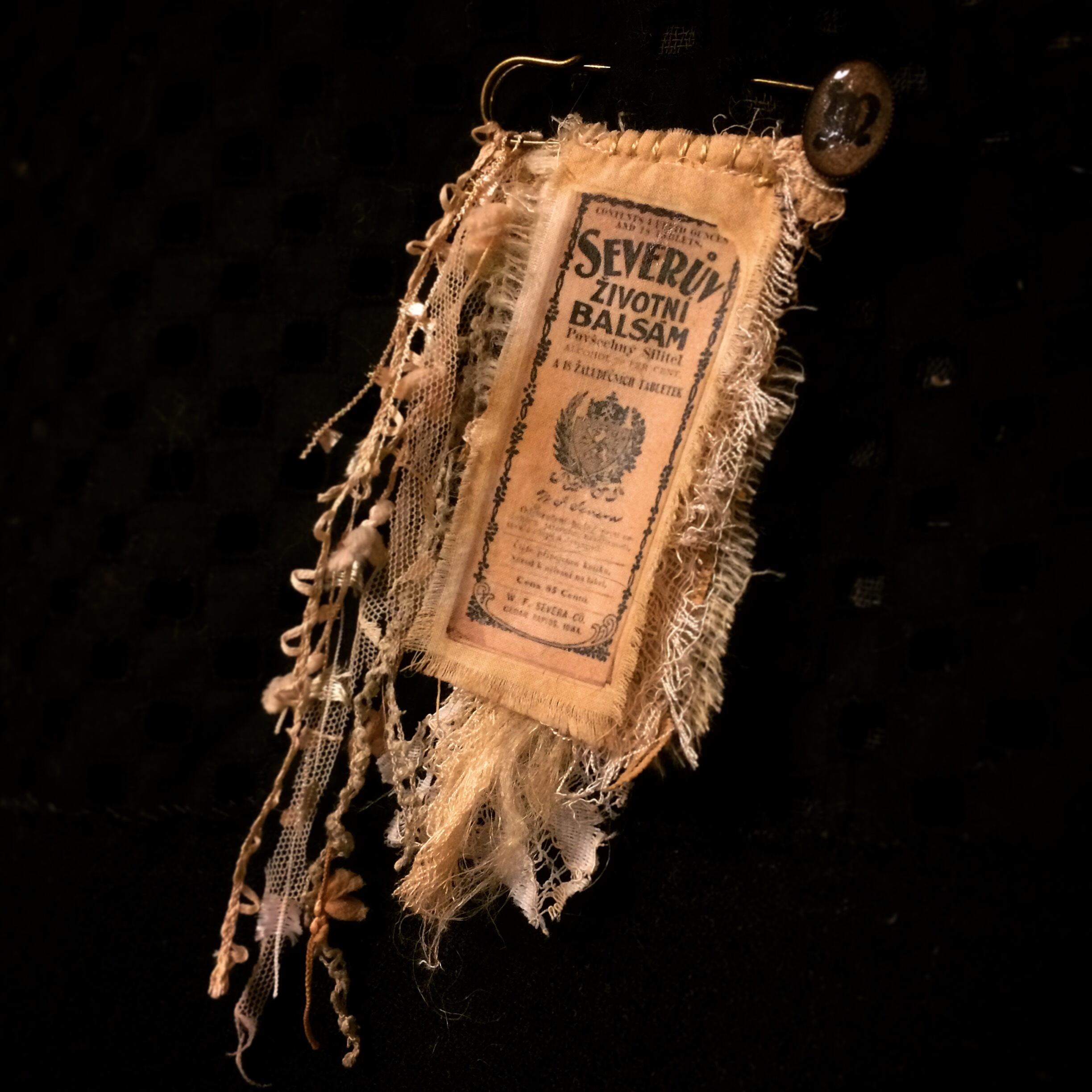 デッドストックの生地、アンティークレース、羊毛などの素材を染色し、ひとつひとつ手作業で縫いあわせた作品となります。
