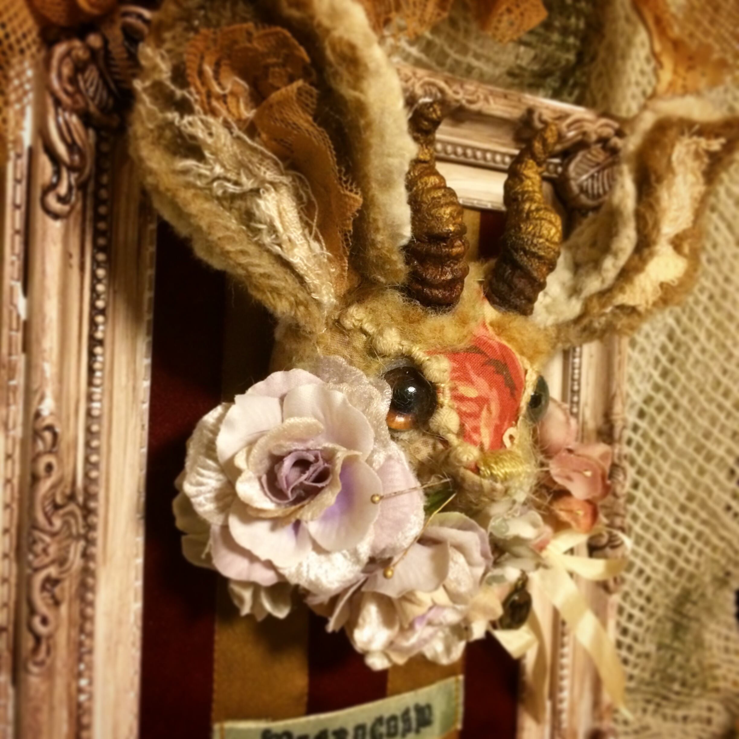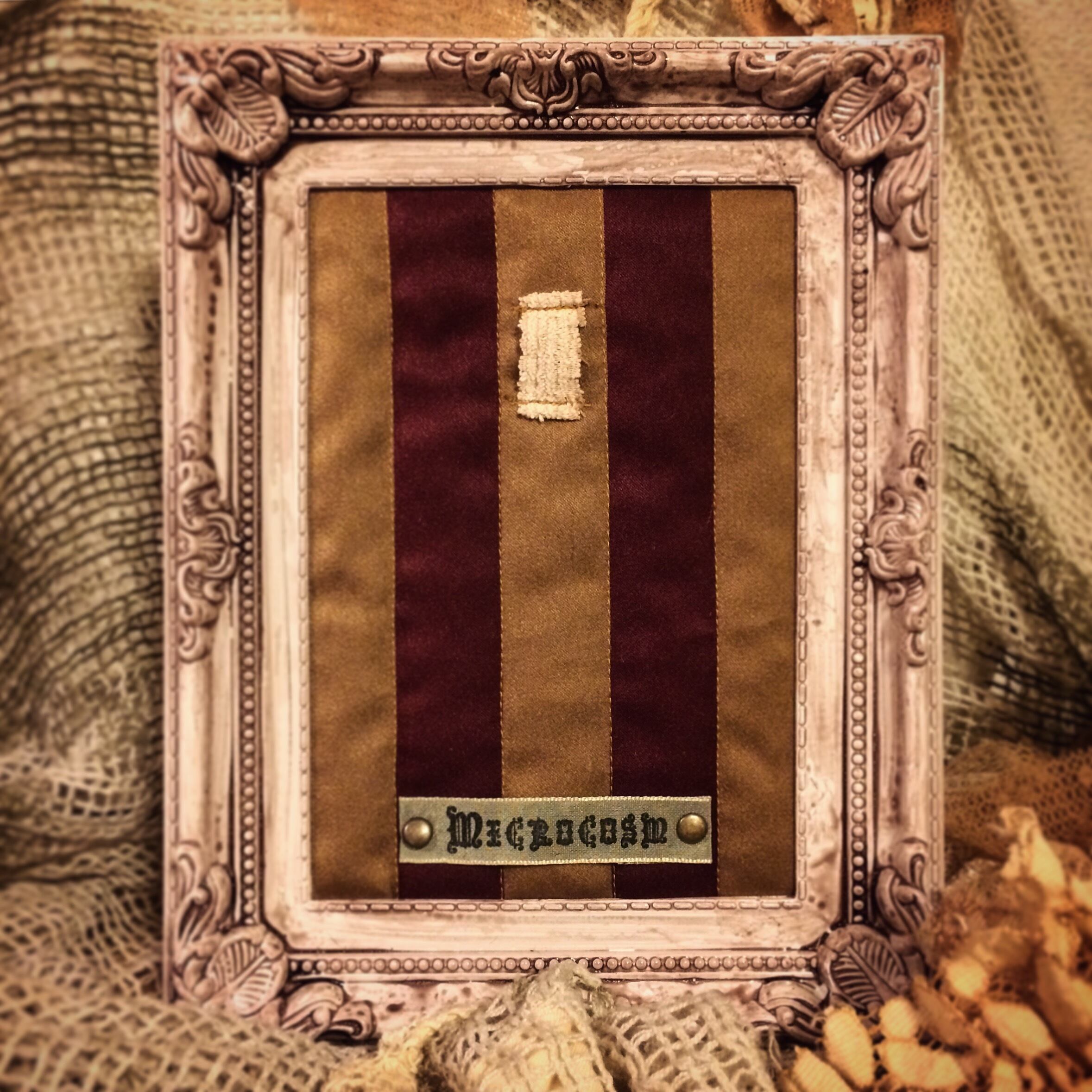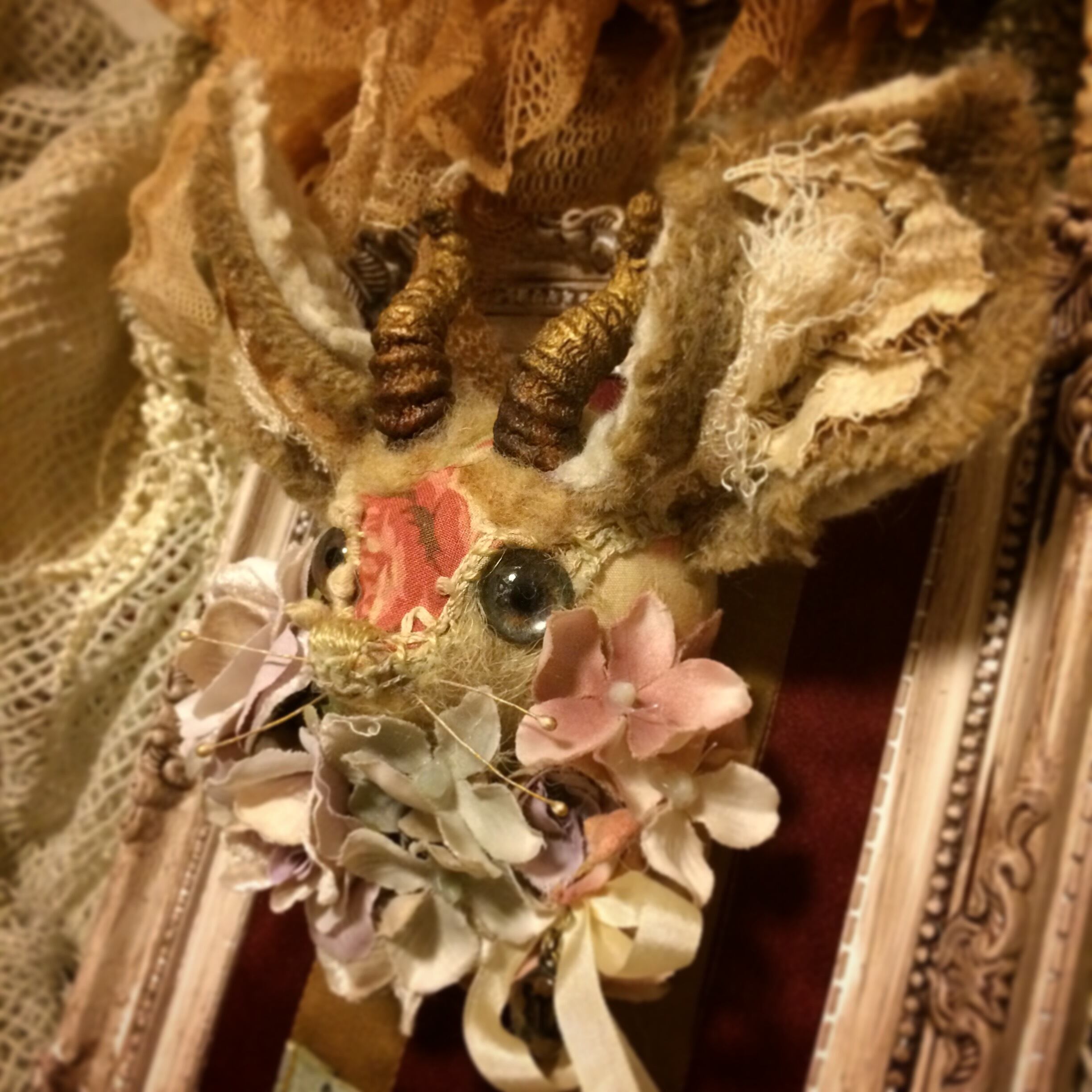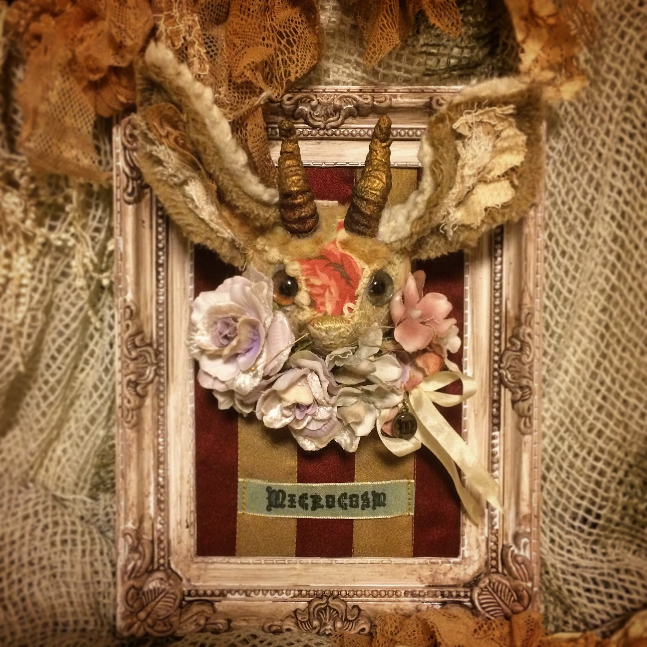 デッドストックの生地、アンティークレース、羊毛などの素材を染色し、ひとつひとつ手作業で縫いあわせた作品となります。